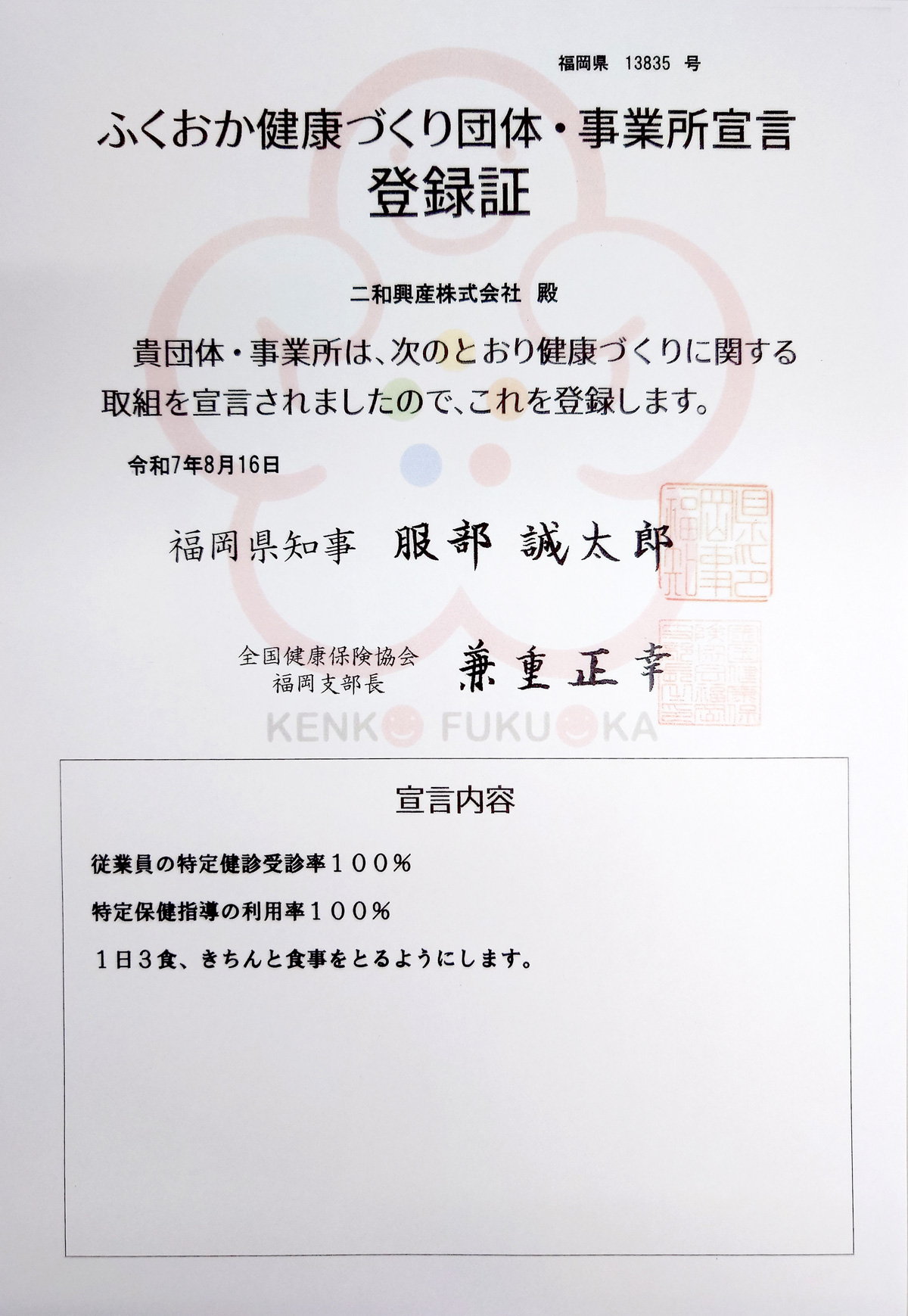 令和7年8月16日、「ふくおか健康づくり団体・事業所宣言」に登録しました。